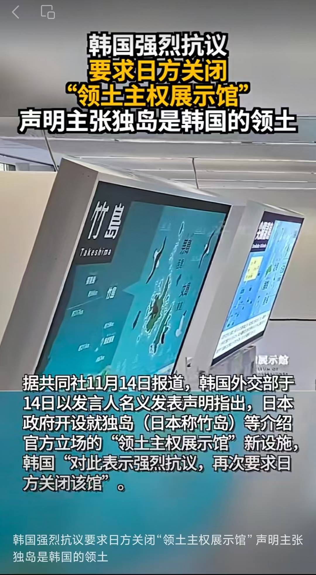 禹元植还说,继日本首相高市早苗近期公开发言宣称独岛(日本称“竹岛”)在历史上、国际法上都是日本领土之后,日本政府日前又追加开放了主张独岛等主权的“领土主权展览馆”扩建空间,“这企图向学生等下一代人植入错误认知,我对此表示强烈遗憾,并敦促日方立即将其关闭”。